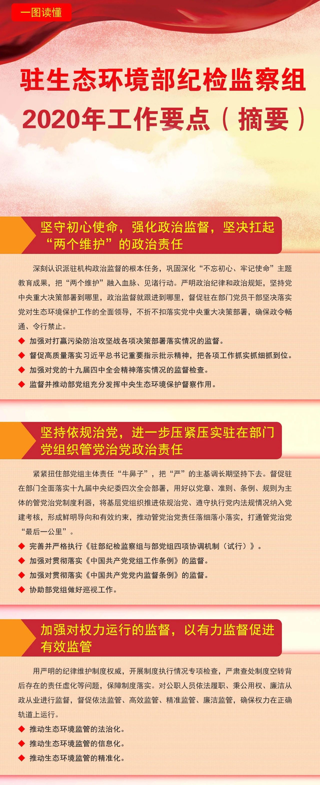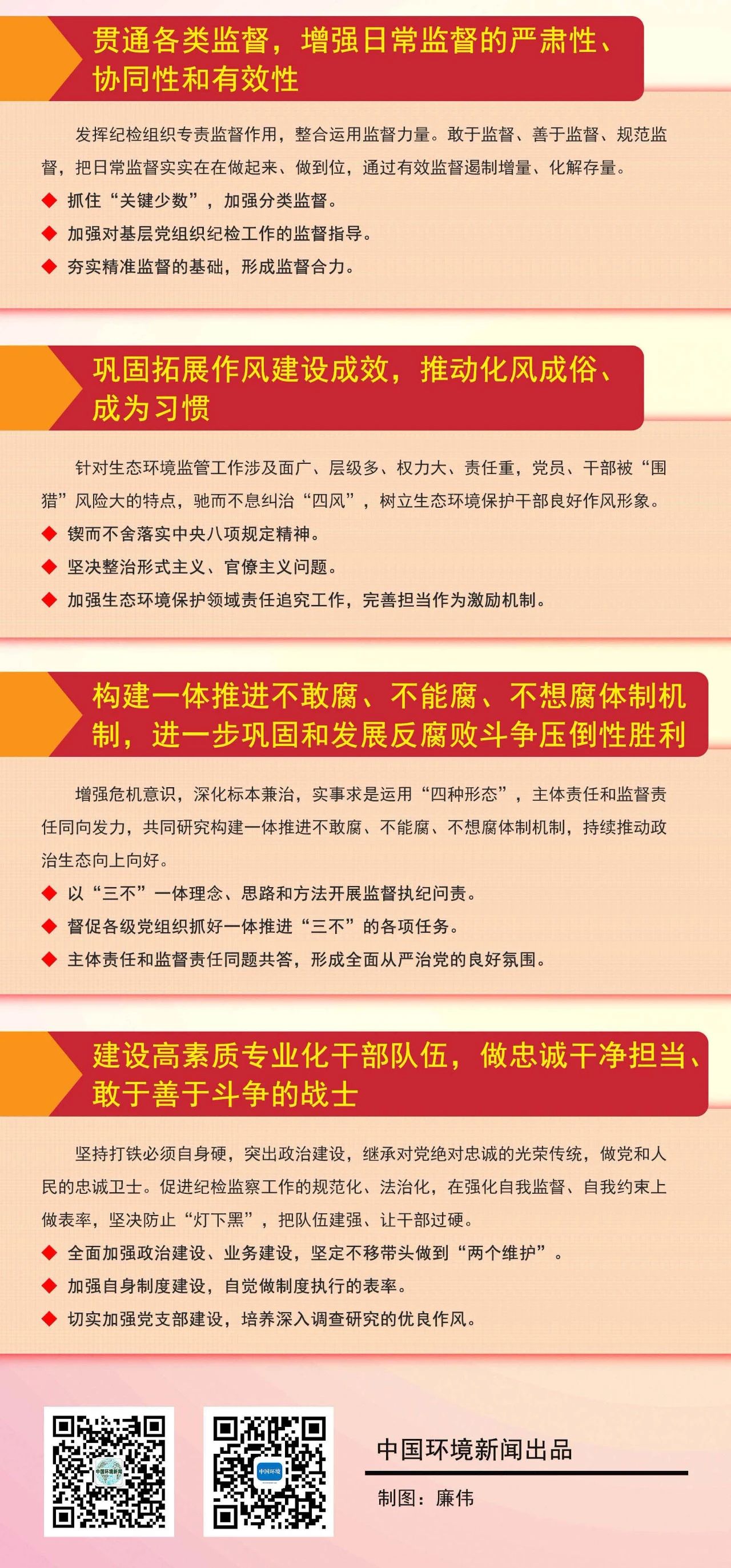 中央紀委國家監委駐生態環境部紀檢監察組(以下簡稱駐部紀檢監察組)要以習近平新時代中國特色社會主義思想為指導,深入貫徹黨的十九大和十九屆二中、三中、四中全會精神,認真落實十九屆中央紀委四次全會部署和深化派駐機構改革要求,增強“四個意識”、堅定“四個自信”、做到“兩個維護”,堅守政治監督職責,堅持穩中求進工作總基調,強化對權力運行的制約和監督,一體推進不敢腐、不能腐、不想腐,推動駐在部門全面從嚴治黨向縱深發展,在堅持和完善中國特色社會主義制度、推進生態環境治理體系和治理能力現代化中充分發揮監督保障執行、促進完善發展作用,為決勝全面建成小康社會、打贏污染防治攻堅戰提供堅強保障。